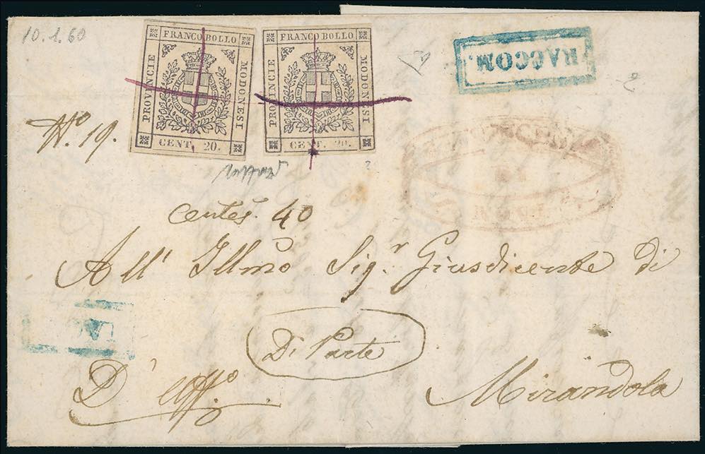 NOVI, penna + cartella azzurra punti R1 - 20 cent. (16a), due esemplari, ottimo stato, su lettera raccomandata del 10/1/1860 per Mirandola. ... Read more