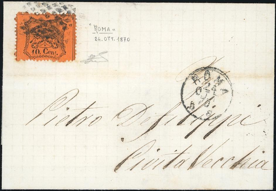 1870 - 10 cent. arancio vermiglio (26), perfetto, su sovracoperta di lettera da Roma 24/10/1870 a Civitavecchia. Molto bella. Ferrario.
