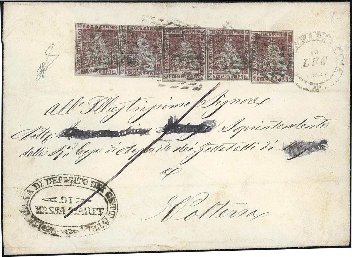 1857 - 1 crazia bruno carminio lillaceo su grigio (4f), due coppie e un singolo, lievi difetti di marginatura, su sovracoperta di lettera di 5 porti da Massa Marittima 19/7/1857 a Volterra. Porto multiplo molto raro! Cert. Ferrario.