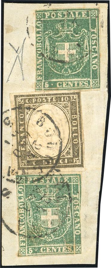 1861 - 5 cent. verde, due esemplari (18), in affrancatura mista con 10 cent. grigio olivastro scuro IV emissione di Sardegna (14Ca), lievi difetti, usati su frammento a Bologna 24/8/1861. UNICA AFFRANCATURA MISTA CONOSCIUTA CON ANNULLO AL DI FUORI DEI TERRITORI DEL GOVERNO PROVVISORIO DI TOSCANA, nonché unico caso noto di utilizzo del francobollo da 5 cent. negli ex territori delle Romagne. Em.Diena, dettagliato cert. Bottacchi.