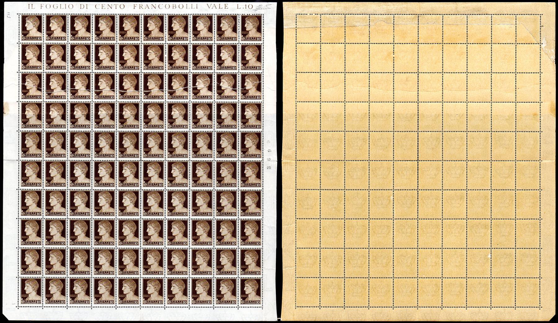 1929 - 10 cent. Imperiale, foglio completo di 100 esemplari, le quattro strisce di 10 esemplari superiori stampate su carta ricongiunta ... Read more
