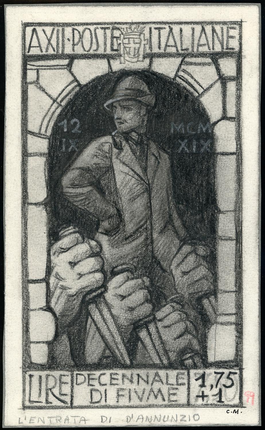 1934 - Decennale dell'Annessione di Fiume. Bozzetto definitivo a carboncino eseguito da Corrado Mezzana, su carta sottile, 12 x 20 cm., con soggetto "Ingresso di Gabriele d'Annunzio a Fiume", adottato per il francobollo da 50 cent. della serie. Splendido ed unico. Ferrario.