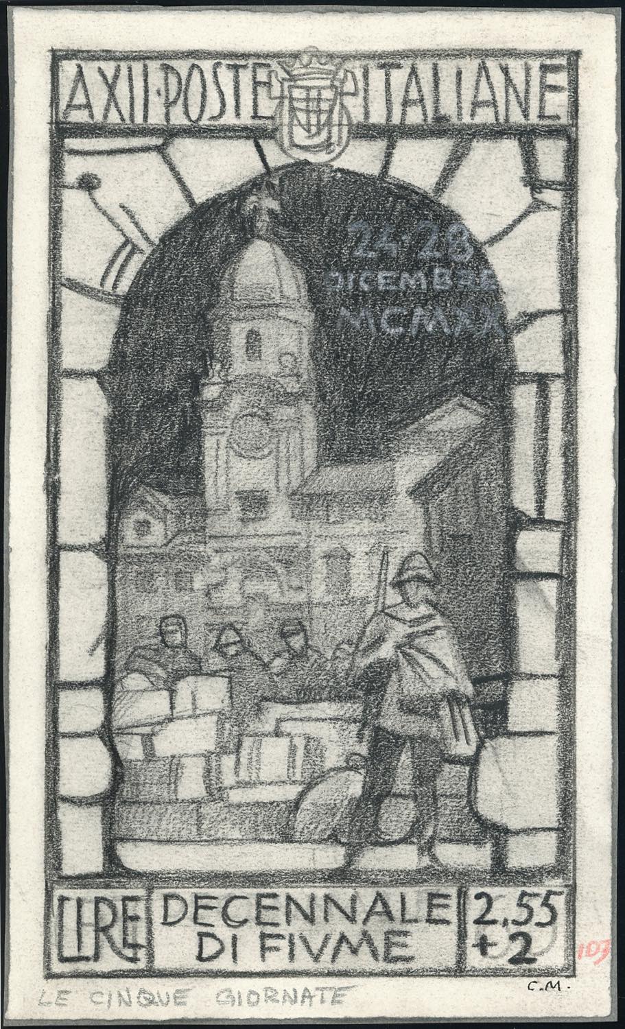 1934 - Decennale dell'Annessione di Fiume. Bozzetto definitivo a carboncino eseguito da Corrado Mezzana, su carta sottile, 12 x 20 cm., con soggetto "Le cinque giornate di Fiume e torre civica", adottato per il francobollo da 1,25 lire della serie. Splendido ed unico. Ferrario.