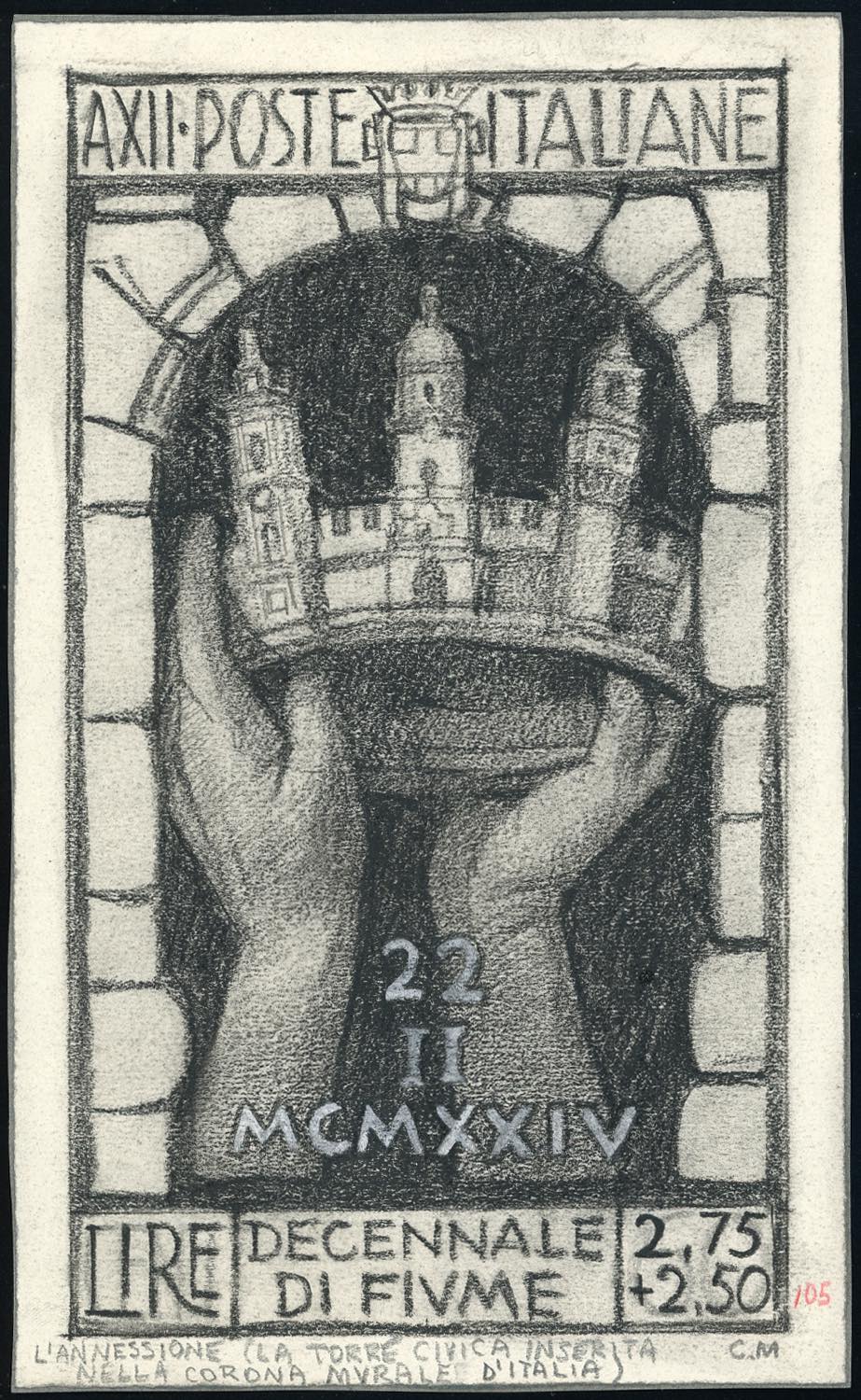1934 - Decennale dell'Annessione di Fiume. Bozzetto definitivo a carboncino eseguito da Corrado Mezzana, su carta sottile, 12 x 20 cm., con soggetto "La torre civica di Fiume, inserita nella corona murale con torri di città italiane, rappresentante l'Annessione", adottato per il francobollo da 1,75 + 1 lira della serie. Splendido ed unico. Ferrario.