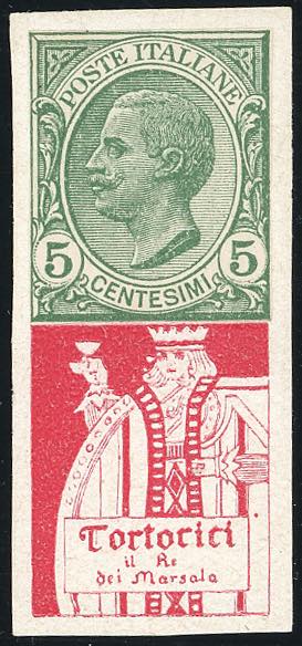 1924 - 5 cent. Leoni tagliato lungo la dentellatura, applicato sopra la vignetta TORTORICI in carminio, prova su carta gessata non gommata e non dentellata. La vignetta fu approntata da Corrado Mezzana. Sia il francobollo che la vignetta non furono poi adottati per l'emissione. Splendida ed UNICA NOTA. Cert. Colla e Ferrario.
