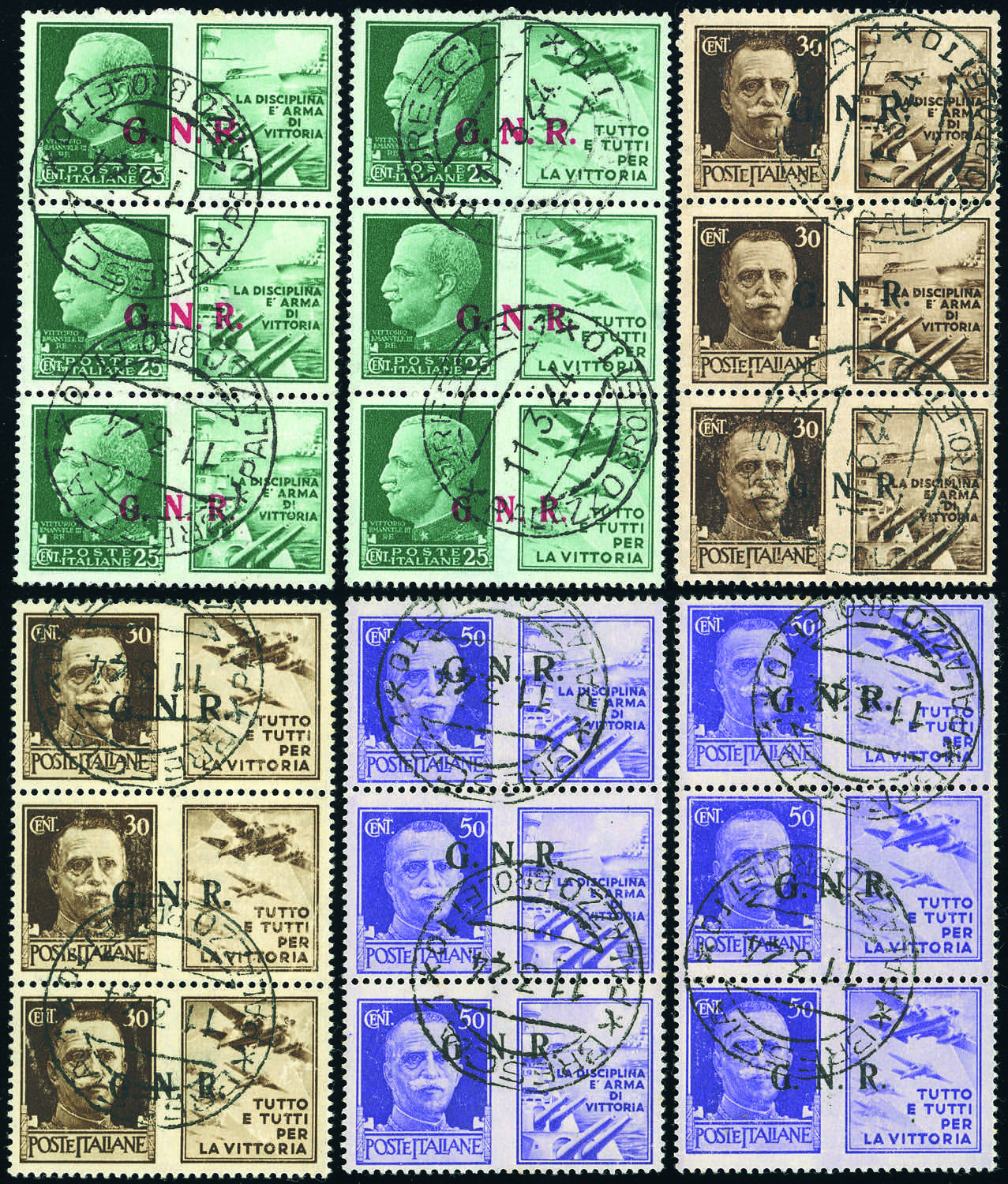 1943 - I sei trittici verticali, con le rispettive soprastampe: G.N.R. del II tipo, G.N.R. del II e R. del II tipo, G.N.R. del III tipo (13/II-IIa-III/23/II-IIa-III), usati a Brescia 11/3/1944, perfetti. Si tratta dell'unica serie completa usata, se ne conosce solo un'altra, ma su busta. Rarità. Sorani, cert. Fiecchi, Ferrario.