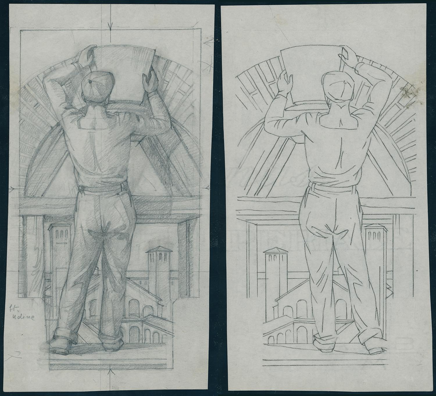 1950 ITALIA AL LAVORO - Bozzetto a matita al recto ed a china al verso, eseguito da Corrado Mezzana, su carta, 21,5 x 11 cm., raffigurante ... Read more