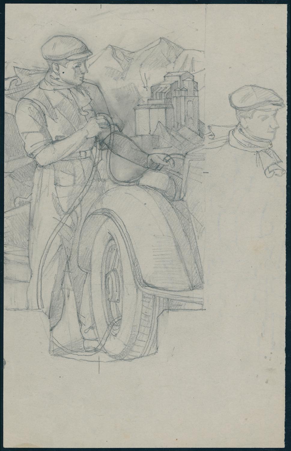 1950 ITALIA AL LAVORO - Bozzetto a matita eseguito da Corrado Mezzana, su carta, 22,5 x 14,5 cm., raffigurante un "Benzinaio che controlla un'automobile". Soggetto non adottato. Splendido e unico.
