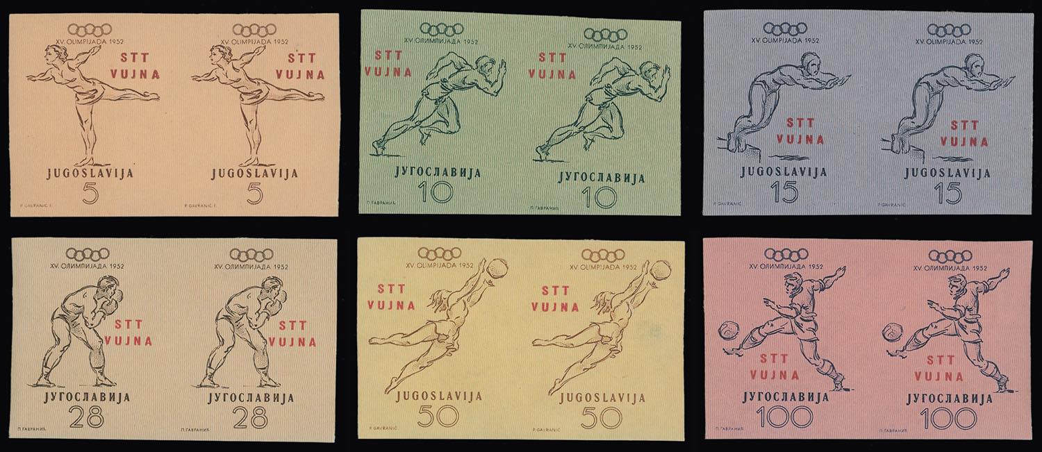 1952 - Olimpiadi (56/61), coppie orizzontali non dentellate, gomma integra, perfette. Molto belle! Cert. Cilio.