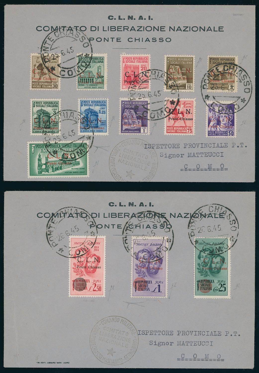PONTE CHIASSO 1945 - L'emissione completa (1/14), perfetta, su due buste ufficiali da Ponte Chiasso rispettivamente del 25 e 26/6/1945. ... Read more