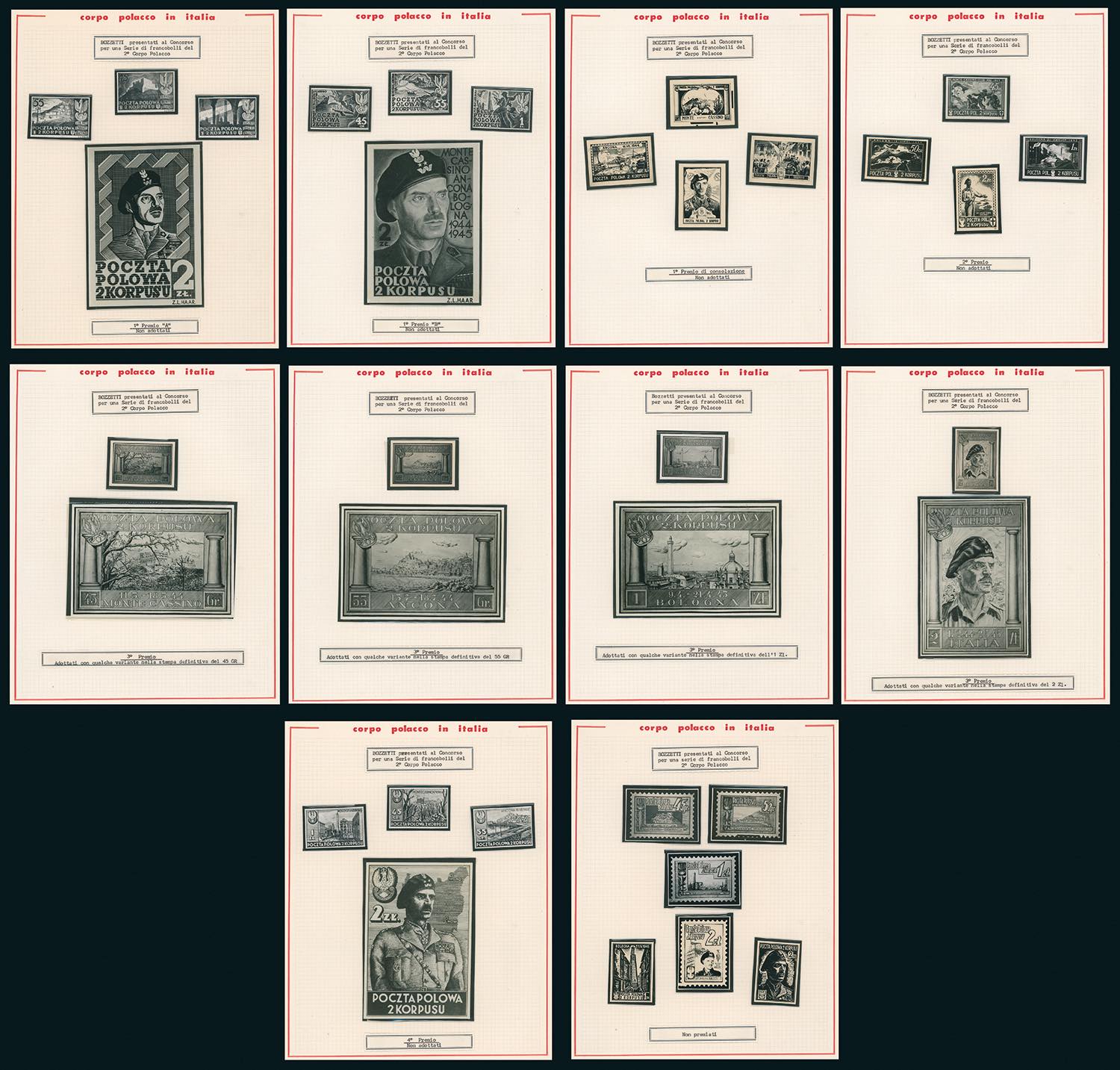CORPO POLACCO 1946 - Eccezionale collezione di 34 saggi fotografici di vari formati, presentati per l'emissione e premiati. Sono presenti 4 saggi (non adottati) che vinsero il 1° premio categoria A, 4 saggi che vinsero il 1° premio categoria B (non adottati), 4 saggi che vinsero il 1° premio di consolazione (non adottati), 4 saggi che vinsero il 2° premio (non adottati), 8 saggi di vari formati che vinsero il 3° premio e furono adottati per l'emissione, 4 saggi che vinsero il 4° premio (non adottati) e infine 6 saggi non premiati. Si tratta di un INSIEME UNICO, di grande fascino ed interesse, da esposizione. Cert. Ferrario.