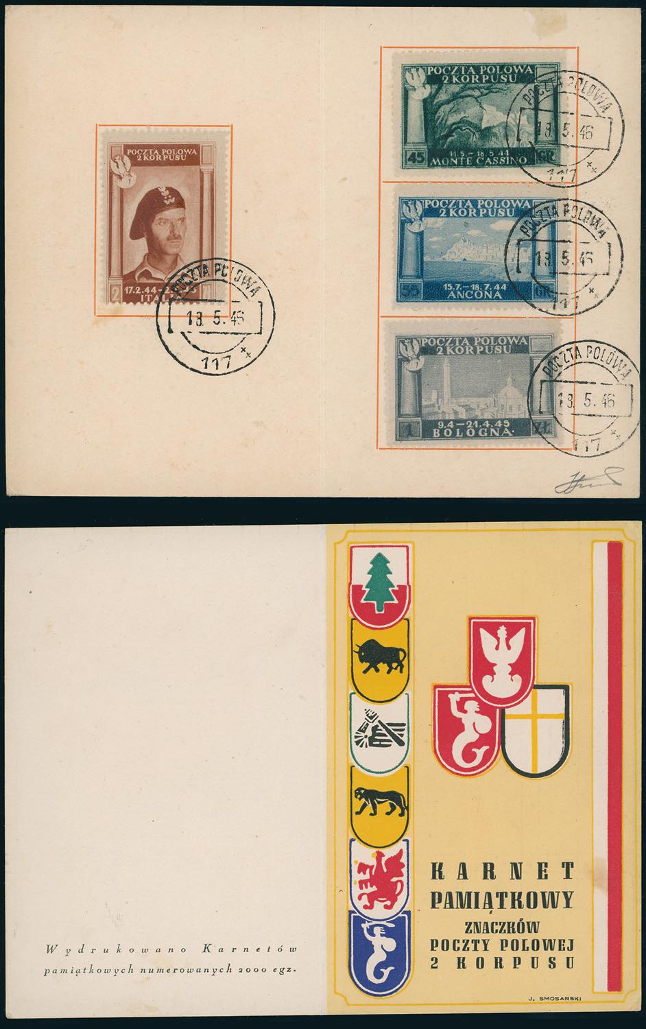 CORPO POLACCO 1946 - Prima emissione completa (1/4), perfetti, usati su carnet speciale non catalogato, annullati con bollo "Poczta Polowa 117 18/5/1946", durante il Regno di Umberto II, a Recanati durante la visita del generale Anders. Ferrario.