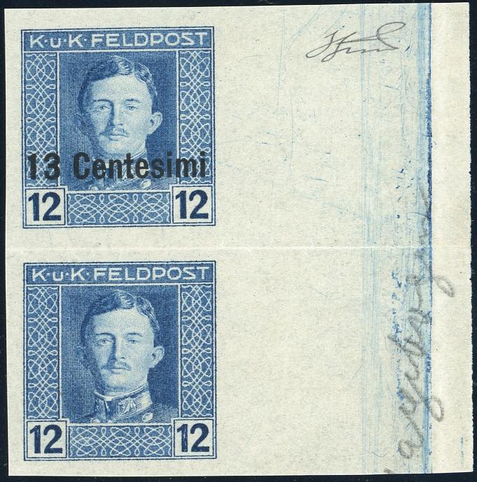 OCCUPAZIONE AUSTRIACA 1918 - 13 cent. su 12 h., coppia verticale non dentellata, il secondo esemplare senza soprastampa (7a), bordo di foglio, nuova senza gomma come sempre, perfetta. Ferrario.