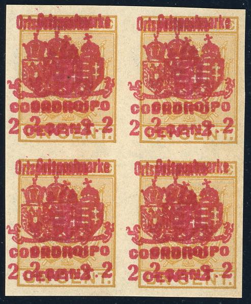 OCC. AUSTRIACA RECAPITO AUTORIZZATO 1918 - 2 cent. su 1 cent. Codroipo, doppia soprastampa di cui una fortemente spostata a sinistra (14aa), blocco di quattro, senza gomma come sempre, perfetto. Ferrario.