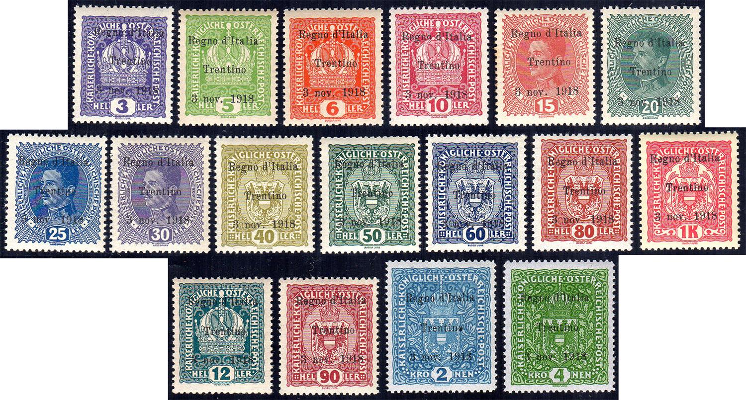 TRENTINO ALTO ADIGE 1918 - Prima emissione (1/17), gomma integra, perfetti. Rari e di splendida qualità! Alcuni valori Em.Diena, cert. Zanaria e Ferrario per gli alti valori e fotocopia cert. Oro Raybaudi del blocchi dei n. 14 e 17.