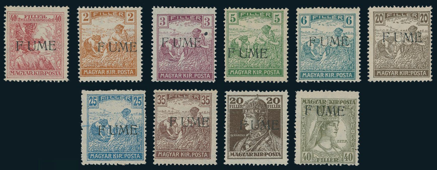 FIUME 1918 - I 10 valori noti con errore di soprastampa a macchina "FIUME", pos. 63 (3d/26d), gomma integra, perfetti. Diversi esemplari ... Read more