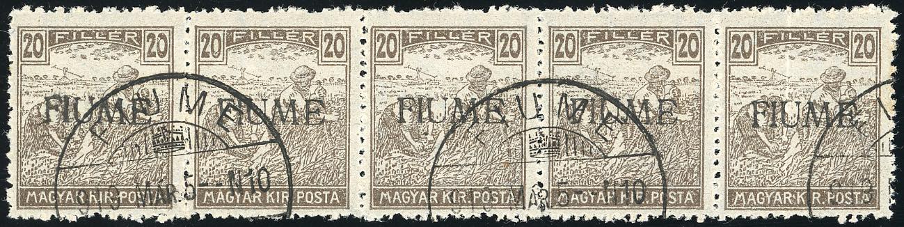 FIUME 1918 - 20 f., soprastampa a mano del V tipo (10/V), striscia orizozntale di cinque, perfetta ad eccezione dell'ultimo esemplare che presenta una piega verticale, usata a Fiume 5/3/1919. Molto rara. Cert. Sorani.
