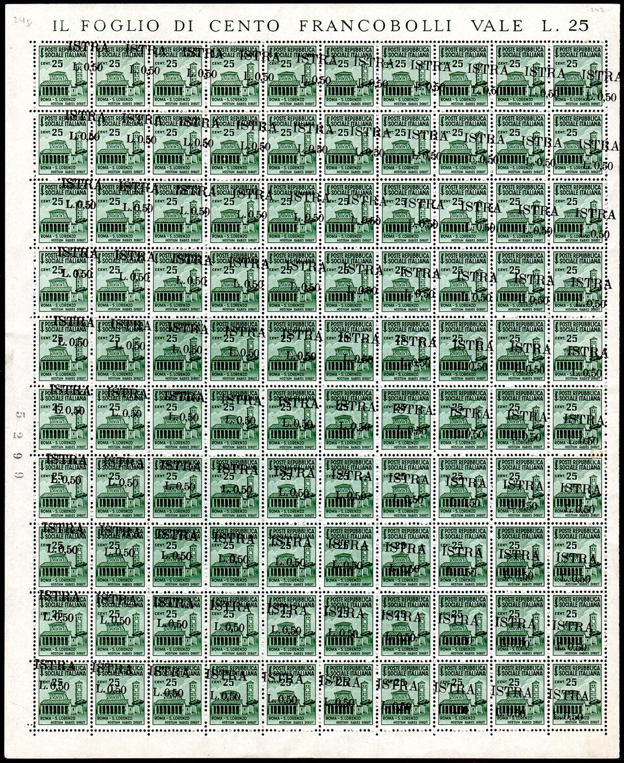 OCC. JUGOSLAVA ISTRIA 1945 - 50 cent. su 25 cent., soprastampa obliqua (24g), foglio completo di 100 esemplari, gomma integra, perfetti. ... Read more