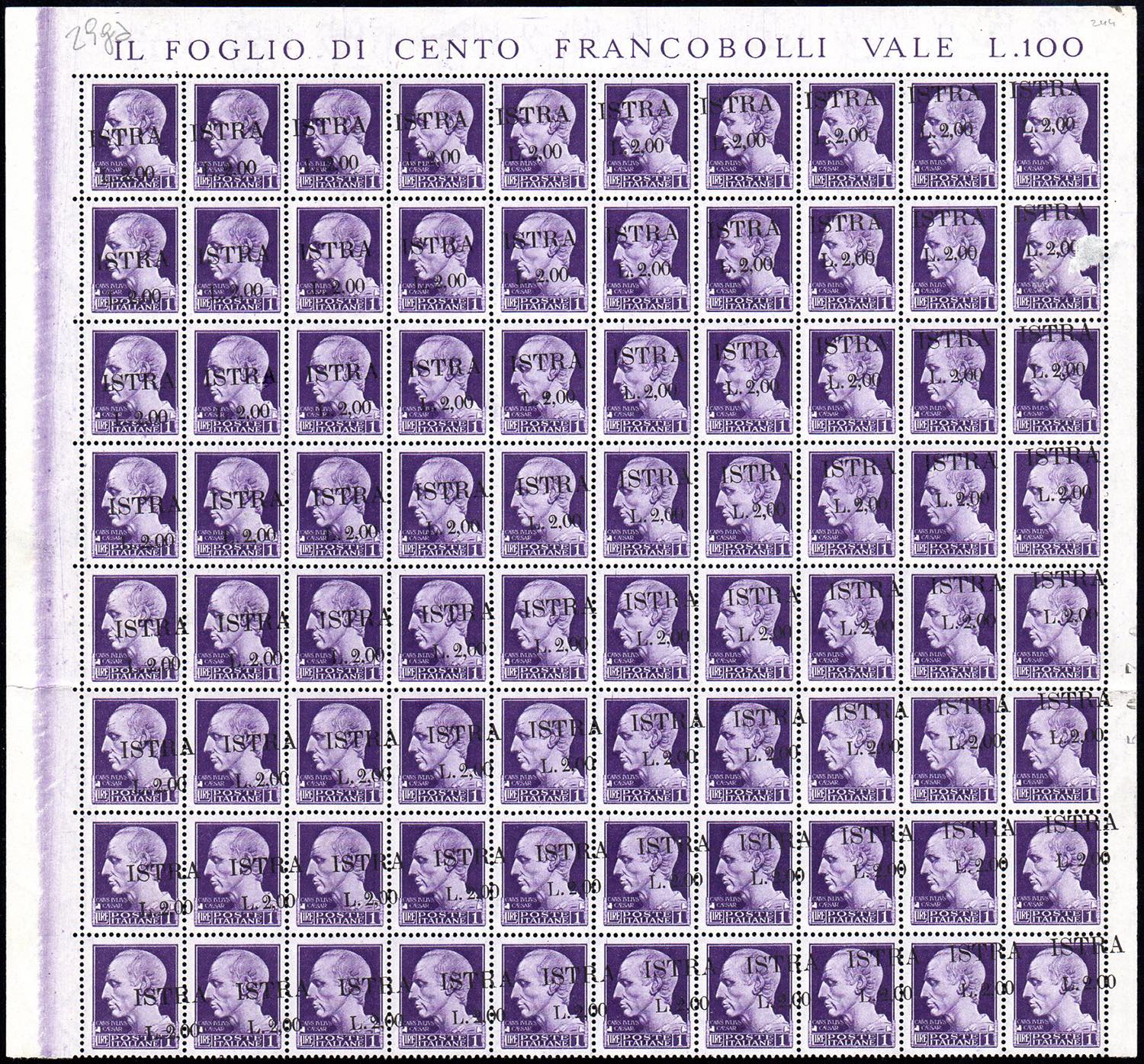 OCC. JUGOSLAVA ISTRIA 1945 - 2 lire su 1 lira, soprastampa obliqua (29ga), blocco di 80 esemplari, gomma integra, un esemplare con abrasione sul fronte, gli altri perfetti. Raro.