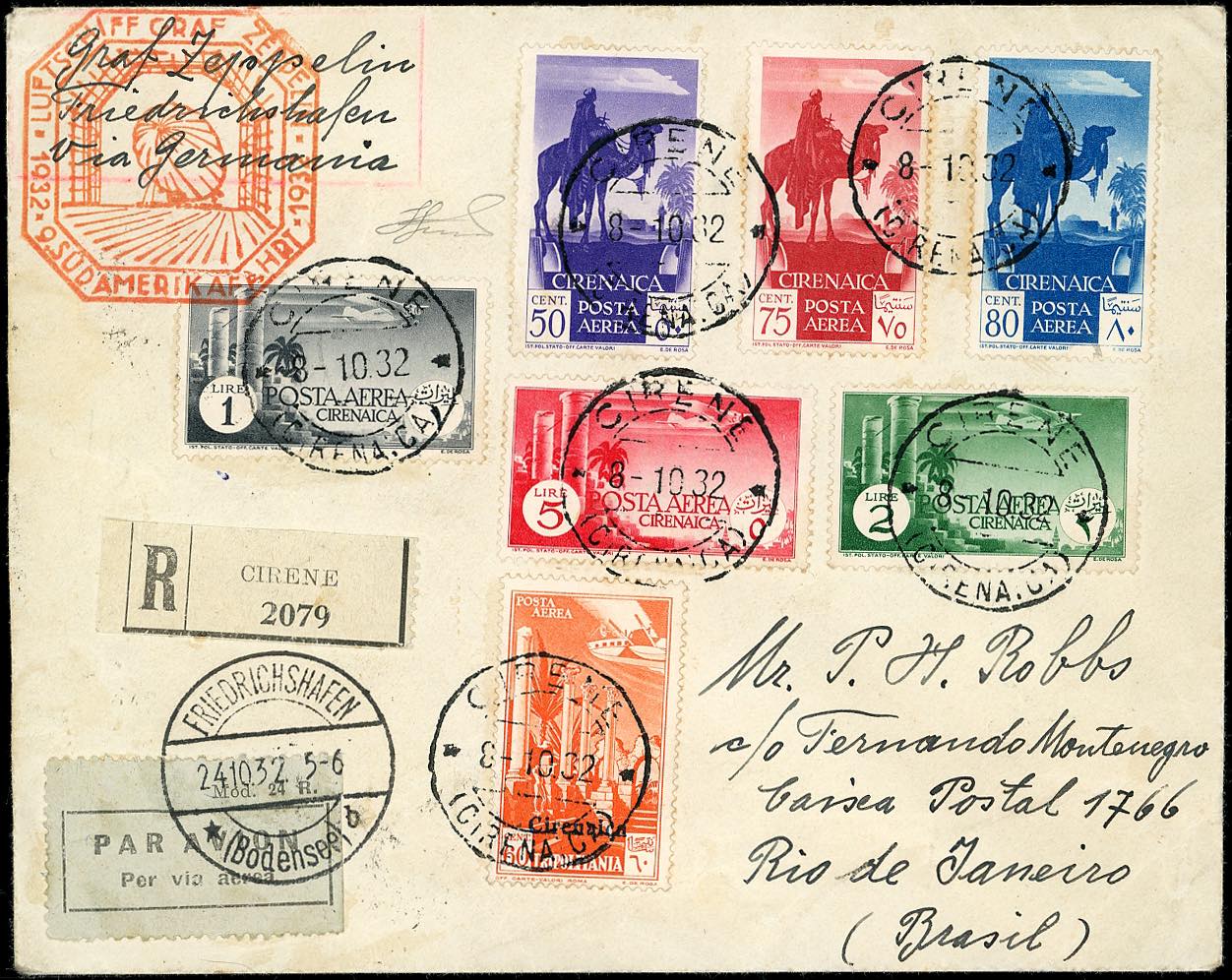 POSTA AEREA ZEPPELIN 1932 - 60 cent. arancio soprastampato e serie completa dei Soggetti Africani (A2,A6/A11), perfetti, su aerogramma raccomandato trasportato dallo Zeppelin 9° Sudamerikafahrt a Rio de Janeiro 28/10/1932 con bolli speciali. Dei pochissimi aerogrammi spediti in tempo e giunti in Sud America, questo partì da Cirene 8/10/1932 tramite un piccolissimo corriere. Si conosce solo un'altra lettera con tale provenienza. Rarità del settore. Cert. Ferrario.