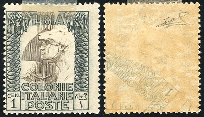 1921 - 1 cent. nero e bruno, Pittorica con filigrana, STAMPA DELLA CORNICE ANCHE AL VERSO (21), nuovo, gomma originale integra, perfetto. Bello e non catalogato, probabilmente unico. Ferrario.
