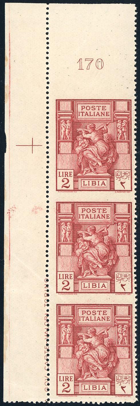 1924 - 2 lire Sibilla Libica, dent. 14, striscia verticale di tre non dentellata orizzontalmente e in alto (43k), angolo di foglio con numero di tavola, gomma integra, perfetta. Splendida e rara. Cert. Ferrario.