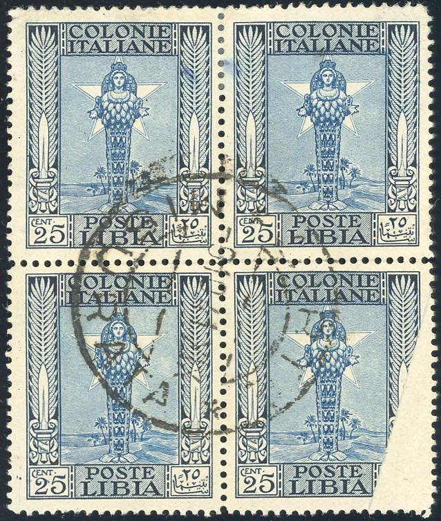 1924 - 25 cent. Pittorica (49), blocco di quattro, un esemplare con stampa parziale dovuta ad un'anomala piegatura del foglio al momento ... Read more