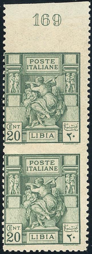 1926 - 20 cent. Sibilla Libica, dent. 11, coppia verticale non dentellata al centro e in alto (54f), bordo di foglio con numero di tavola, gomma originale integra, perfetta. Rara e molto fresca. Ferrario, cert. Raybaudi.
