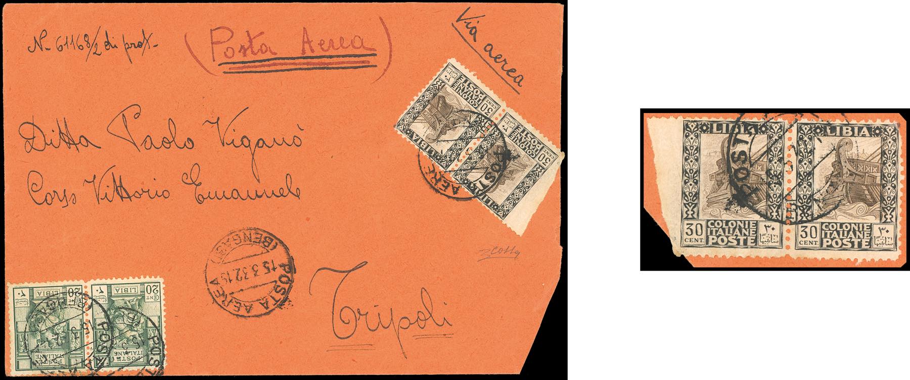 1932 - 30 cent. Pittorica, dent. 11, coppia orizzontale, il primo esemplare non dentellato a sinistra, bordo di foglio, 20 cent. Sibilla Libica, dent. 11, coppia (63g,54), perfetti, su aerogramma da Bengasi 15/3/1932 a Tripoli. Si tratta dell'UNICO ESEMPLARE NOTO di questa varietà. Rarità dell'emissione. Cert. Colla.