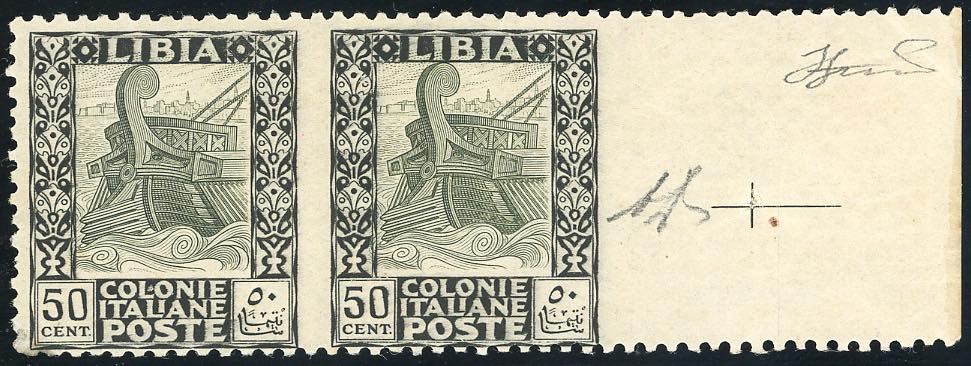 1927 - 50 cent. Pittorica, dent. 11, coppia orizzontale non dentellata al centro e a destra (64k), bordo di foglio, gomma originale ... Read more