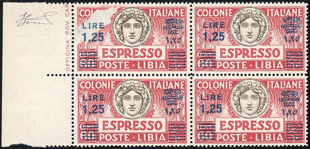 ESPRESSI 1936 - 1,25 lire su 60 cent., dent. 14 (17), blocco di quattro, il primo esemplare con un'abrasione precedente alla soprastampa, ... Read more