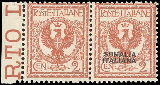 1927 - 2 cent. Floreale, coppia orizzontale di cui uno senza soprastampa (92d), nuova, gomma originale integra, perfetta. Molto bella e ... Read more