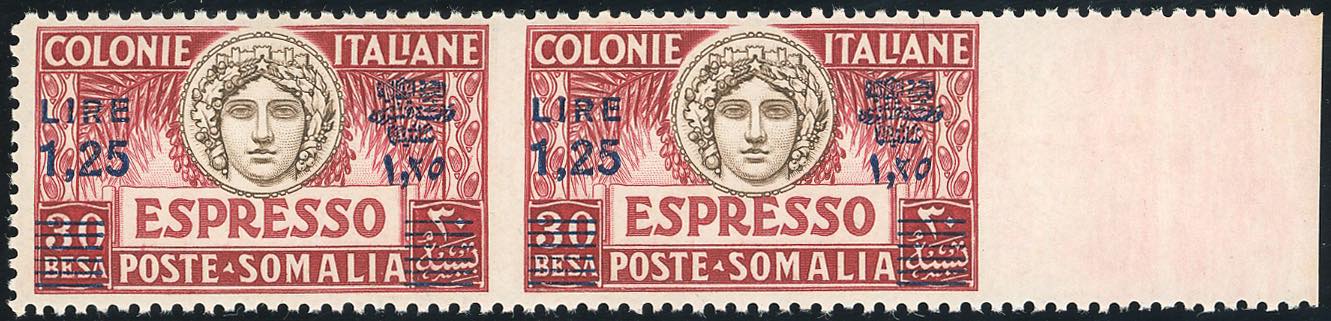 ESPRESSI 1927 - 1,25 lire su 30 b., dent. 11, coppia orizzontale non dentellata al centro e a destra (7e), bordo di foglio, gomma integra, ... Read more