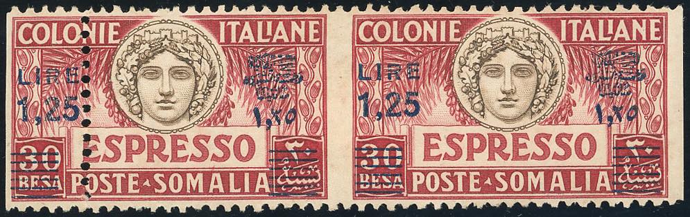 ESPRESSI 1927 - 1,25 lire su 30 b., coppia orizzontale non dentellata al centro e a destra, con la dentellatura sinistra fortemente spostata a destra (come 7ea ma in coppia), gomma originale, perfetta.