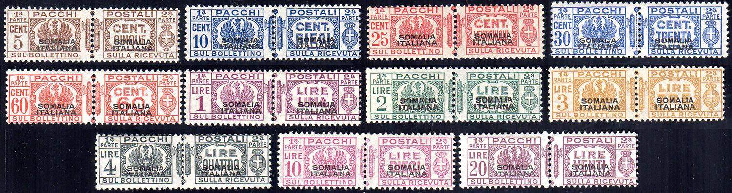 PACCHI POSTALI 1928/41 - Fasci al centro con soprastampa del I tipo, serietta di 11 valori (54,57,59/65), gomma integra, perfetti. Molto ... Read more