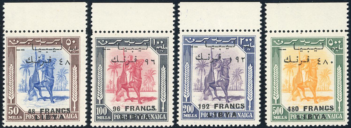 LIBIA REGNO INDIPENDENTE 1951 - Emissione per il Fezzan, alti valori, I tiratura, lettere "CS" schiacciate in alto (20f/23f), bordo di foglio, gomma integra, perfetti. Bellissimi. Cert. Ferrario.