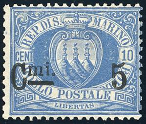 1892 - 5 cent. su 10 cent. oltremare, soprastampato (8A), nuovo, gomma originale, lieve traccia di linguella, perfetto. Molto fresco e ... Read more