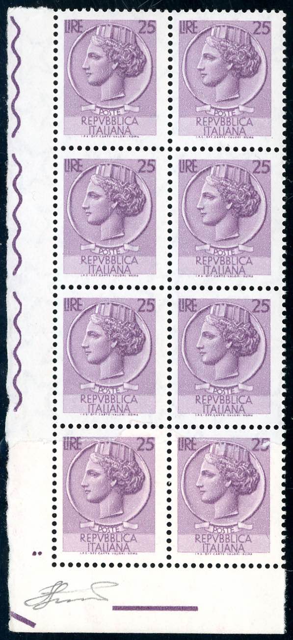 1955 - 25 lire Siracusana, filigrana stelle IV, blocco verticale di otto, i due esemplari inferiori stampati su carta ricongiunta ... Read more