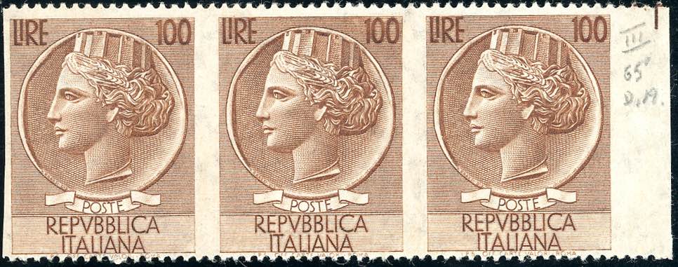 1955 - 100 lire Turrita, filigrana stelle III tipo, striscia orizzontale di tre, non dentellata verticalmente (785/IId), gomma integra, perfetta. Chiavarello.