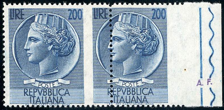 1957 - 200 lire Turrita, filigrana stelle II, coppia orizozntale non dentellata a destra con la dentellatura centrale fortemente spostata a ... Read more