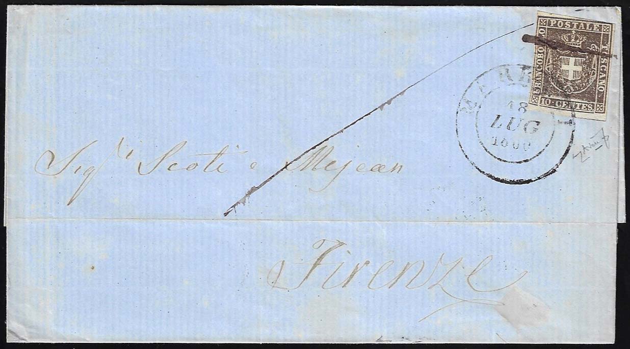 MARRADI, doppio cerchio grande + penna coannullatori punti 10 (Sassone 2020) - 10 cent. (19c), leggermente sfiorato in alto, su sovracoperta di lettera del 18/7/1860 per Firenze. Combinazione di annulli ad oggi inedita! Cert. Avanzo.