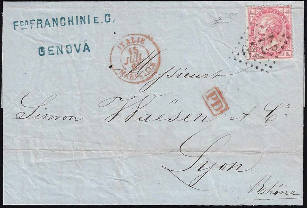 1865 - MARSIGLIA, 2240 punti piccoli con cifre grandi, punti 6 - 40 cent. De La Rue (L20), su lettera, imbarcata sul piroscafo, da Genova 3/7/1865 a Lione, annullato allo sbarco a Marsiglia. Ferrario.