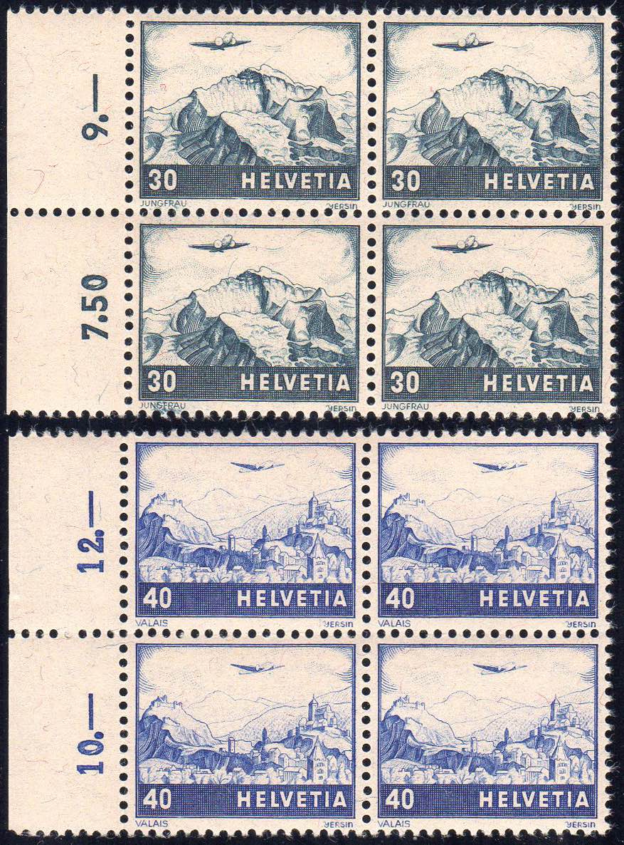 SVIZZERA POSTA AEREA 1948 - Vedute (42/43), blocchi di quattro, bordo di foglio, gomma integra, perfetti. Belli.