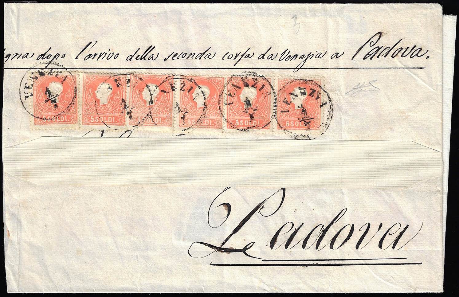 1859 - 5 soldi rosso, I tipo (25), 6 esemplari, perfetti, su gran parte di sovracoperta di lettera da Venezia a Padova. Rara affrancatura multipla! Ferrario.