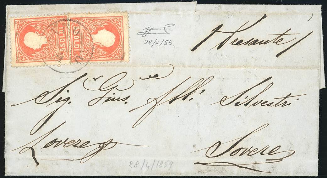 SARONNO, C1 punti 9 - 5 soldi, due esemplari (30), perfetti, su sovracoperta di lettera del 28/4/1859 per Lovere. Interessante lettera risalente all'inizio della II Guerra d'Indipendenza. Ferrario.