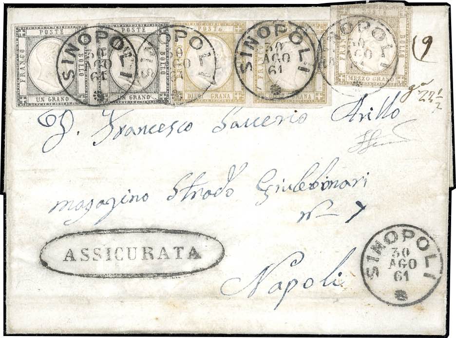 1861 - 1 grano nero, 10 grana bistro oliva, entrambi in coppie orizzontali, perfette, 1/2 grano bistro bruno, leggermente difettoso (18,19,22b), su sovracoperta di lettera assicurata da Sinopoli 30/8/1861, punti 9, a Napoli. Affrancatura di 22 grana e 1/2 probabilmente UNICA e tariffa molto rara, giustificata dal fatto che era presente uno stampato allegato alla lettera. Ferrario, cert. E.Diena.
