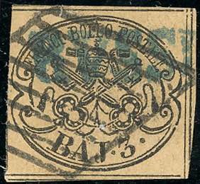 RUSSI, SD azzurro punti 12 - 3 baj (4), piccolo taglietto in alto, esterno al disegno, annullato con il lineare e la griglia. Raro annullo. Chiavarello. Ex coll. Imperato.