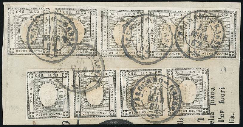 1862 - 1 cent. per stampati (19), striscia di cinque perfetta e striscia di quattro, appena sfiorata in alto a destra, usata su frammento ... Read more