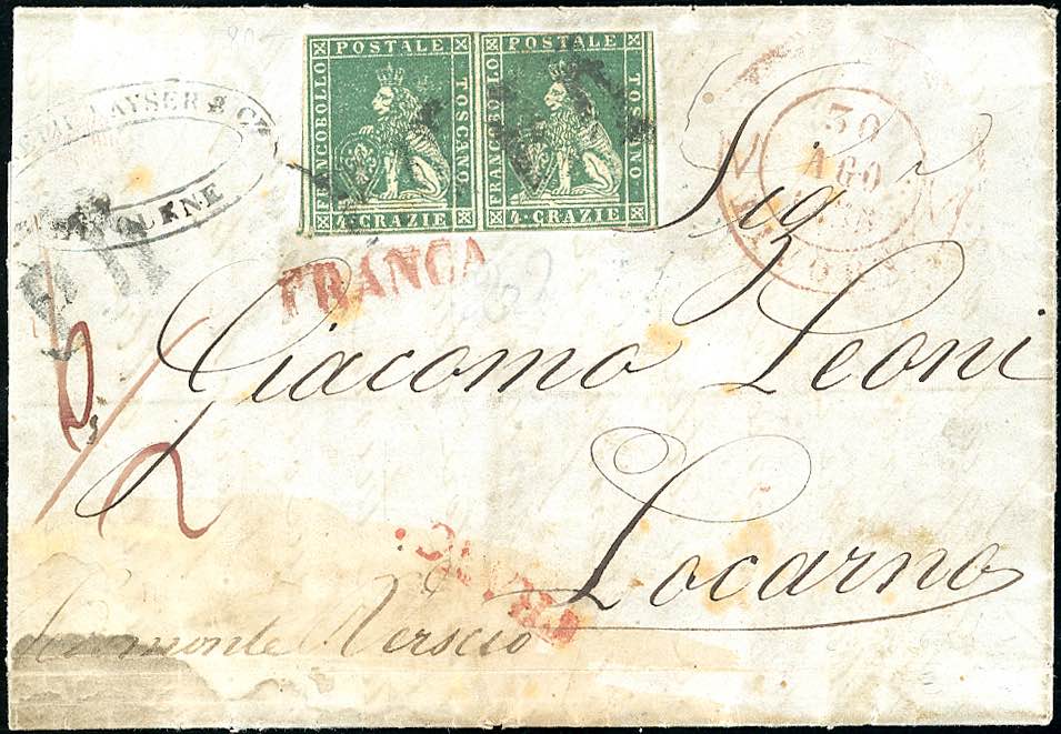 1855 - 4 crazie verde su grigio (6), coppia, difetti, su lettera franca a destino da Livorno 30/8/1855 a Locarno, sul fronte indicati i diritti per la Lega, 6 crazie, per la Svizzera, 2 crazie.