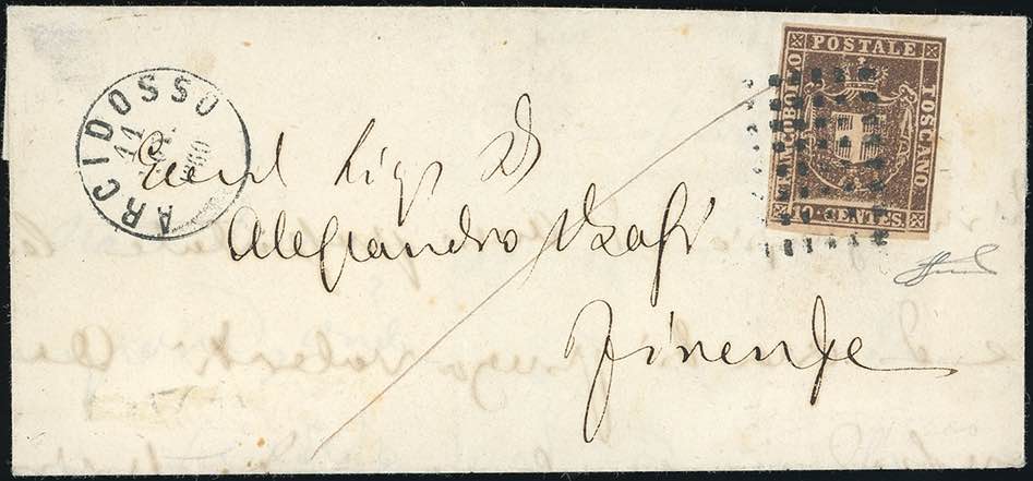 ARCIDOSSO, muto punti 7 - 10 cent. (19), margine destro rasente ma completo, su sovracoperta di lettera dell'11/11/1860 a Firenze. Ferrario.